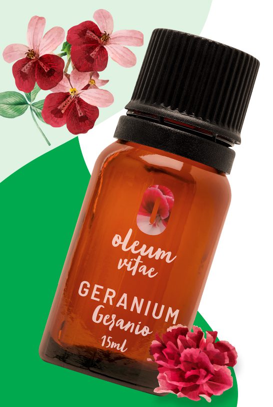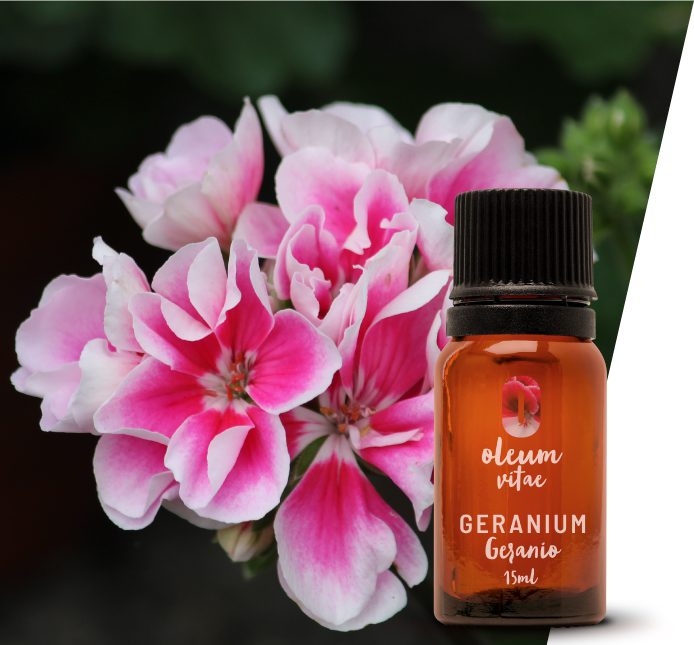 El geranio es un arbusto perenne nativo del sur de África, aunque hoy se ha esparcido en todo el mundo. En 1960 fue llevado a Europa para ser cultivado por la industria francesa, donde empezó a ser utilizado en perfumería sustituyendo al aceite de rosa. El aceite de geranio se obtiene de los vapores y hojas de las plantas. Las hojas son más aromáticas que las flores.